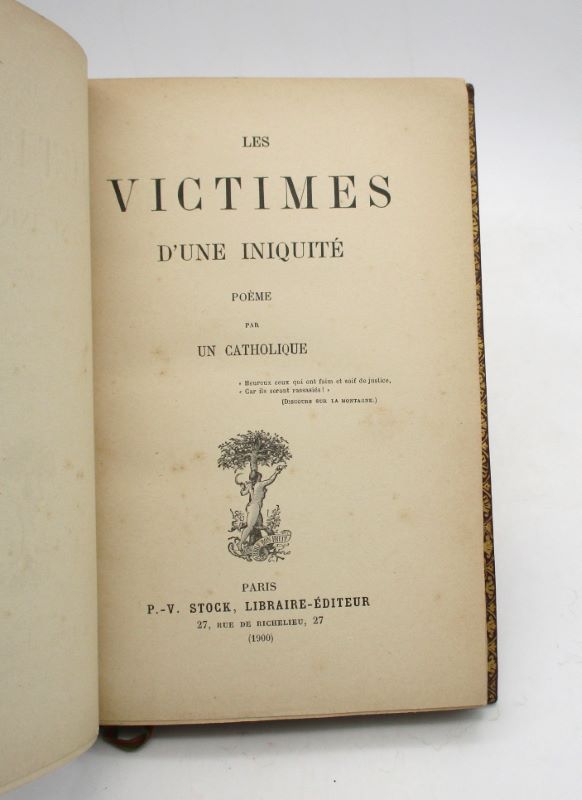 Rarissime édition originale de ce dialogue en vers mettant en scène le procès d’Émile Zola devant la Cour d’assises de Paris. Cet exemplaire comporte un envoi autographe signé de l’auteur à son éditeur Pierre-Victor Stock ainsi que huit vers datés du 1er mars 1901 dans lesquels le poète le loue de son engagement dans l’affaire Dreyfus. En effet, le célèbre éditeur publia plusieurs ouvrages prenant fait et cause pour l’ancien capitaine. Cet étrange ouvrage débute sur une longue introduction au contexte de sa publication, à savoir la seconde condamnation par le Conseil de guerre du militaire puis l’ignominieuse loi d’amnistie qui suivit. Il revient sur les principaux points de l’affaire Dreyfus via le procès qui fut fait à Zola par le général Billot suite à son fameux article « J’accuse…! » paru dans l’Aurore. Les principaux personnages de l’affaire y sont évoqués, jusqu’à l’opinion publique et l’écho de la presse hostile qui interviennent tel un choeur dans les tragédies antiques. Ce vibrant plaidoyer pour la Justice est d’une insigne rareté : le CCfr en annonce seulement quatre exemplaires, tous conservés à la BnF et le Worldcat en recense une douzaine, tous dans des instituions américaines ou canadiennes. Il ne nous a pas été possible d’en trouver trace sur le marché. On joint la nécrologie de Paul Viollet, chartiste et catholique dreyfusard, rédacteur des statuts de la Ligue des droits de l’Homme qui fut créée pour soutenir le capitaine Alfred Dreyfus. L’article a été rédigé par Henri Welschinger de l’Institut et est datée à la main de janvier 1915. Exemplaire remarquable par sa provenance ainsi que son poème et son envoi autographe signé.