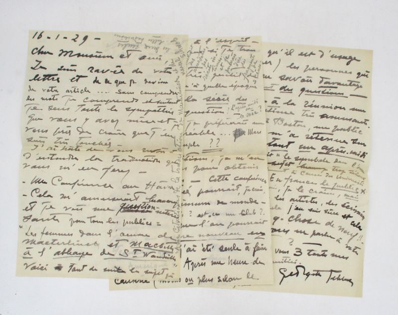 Lettre autographe signé à un correspondant non identifié qu’elle remercie pour un article dans une langue étrangère et en demande la traduction. Elle souhaite faire une conférence sur « Les femmes dans l’oeuvre de Maeterlinck et McBeth à l’abbaye de St Wandrille » et discute avec lui des détails pour son organisation. Elle évoque une conférence donnée à Boston sur « Le symbole dans l’oeuvre de Maeterlinck ». Leblanc et Maeterlinck entretinrent une relation amoureuse qui dura plus de vingt ans.