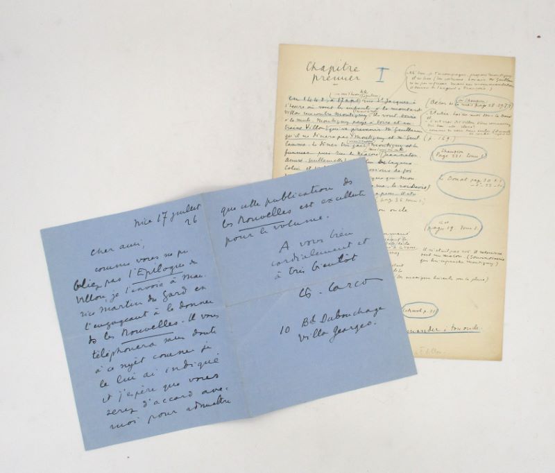 Lettre autographe signée à destinataire non identifié auquel il reproche de ne pas publier l’épilogue du Roman de François Villon et souhaite l’envoyer à Maurice Martin du Gard pour une publications dans la revue des Nouvelles Littéraires. Le numéro 200 du samedi 14 août comporte un article de Frédéric Lefèvre sur ce roman. Cette lettre est accompagnée d’un fragment du manuscrit du premier chapitre de cette biographie du poète français avec les notes et les citations bibliographiques dont celles de Schwob ou Champion.