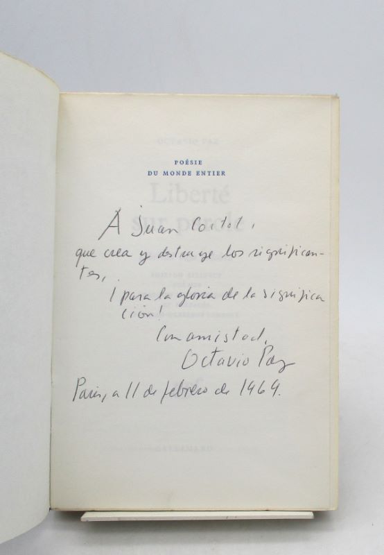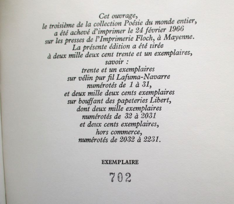 Édition originale bilingue espagnol-français, traduite et préfacée par Jean Clarence Lambert. Un des 2000 exemplaires sur bouffant des papeteries Libert, second papier après 31 pur fil, celui-ci comporte un long envoi autographe signé de l’auteur en espagnol à « Juan [Jean] Cortot », peintre et illustrateur français. Bon exemplaire.