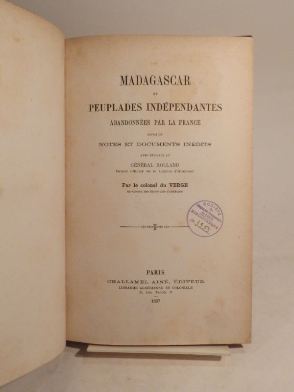 Estimation du livre « madagascar et peuplades indépendantes abandonnées par la France, suivis de Notes et Documents inédits, avec Dédicace au Général Rolland […], par le colonel du Verge […]. »