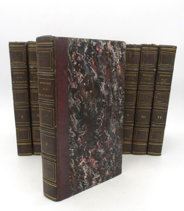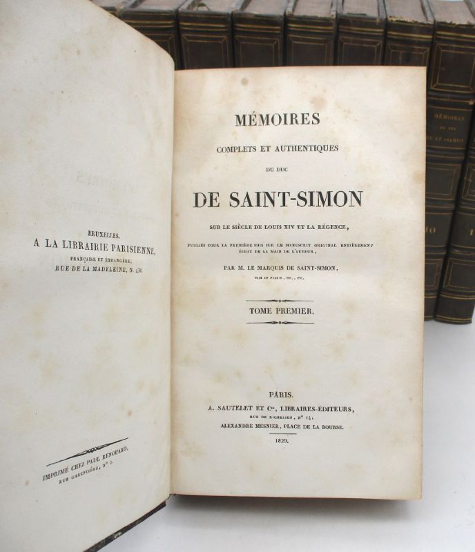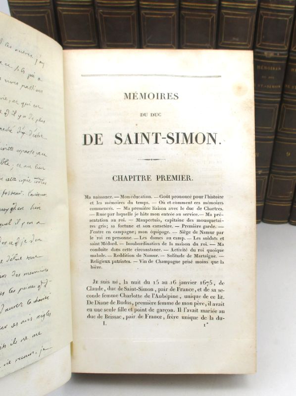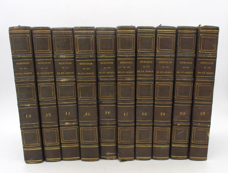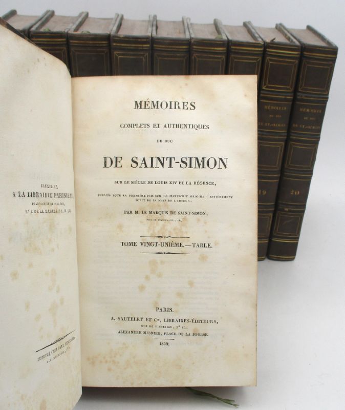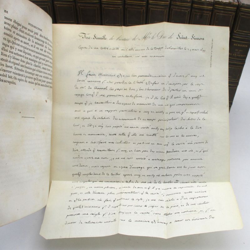 Première édition complète des Mémoires, établie par le marquis de Saint-Simon. Elle est ornée d’un portrait de l’auteur d’après Belliard et lithographié par Villain relié en frontispice du XXe volume, d’un fac-similé d’une lettre de l’auteur au Ier, de la carte dépliante du Parlement au XIe et celle de l’antichambre du roi au XVIIe. Le dernier volume comporte les tables des chapitres et de noms cités avec, pour chacun, une courte notice biographique ainsi que deux réclamations de descendants de personnages apparaissant dans ces mémoires.