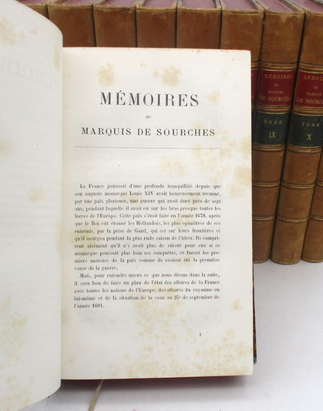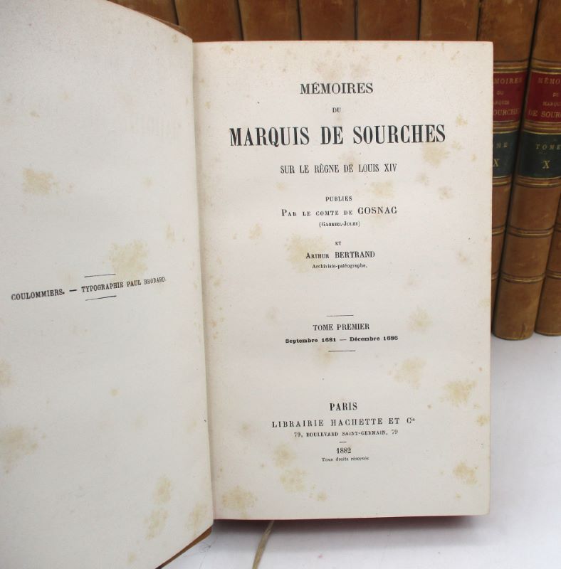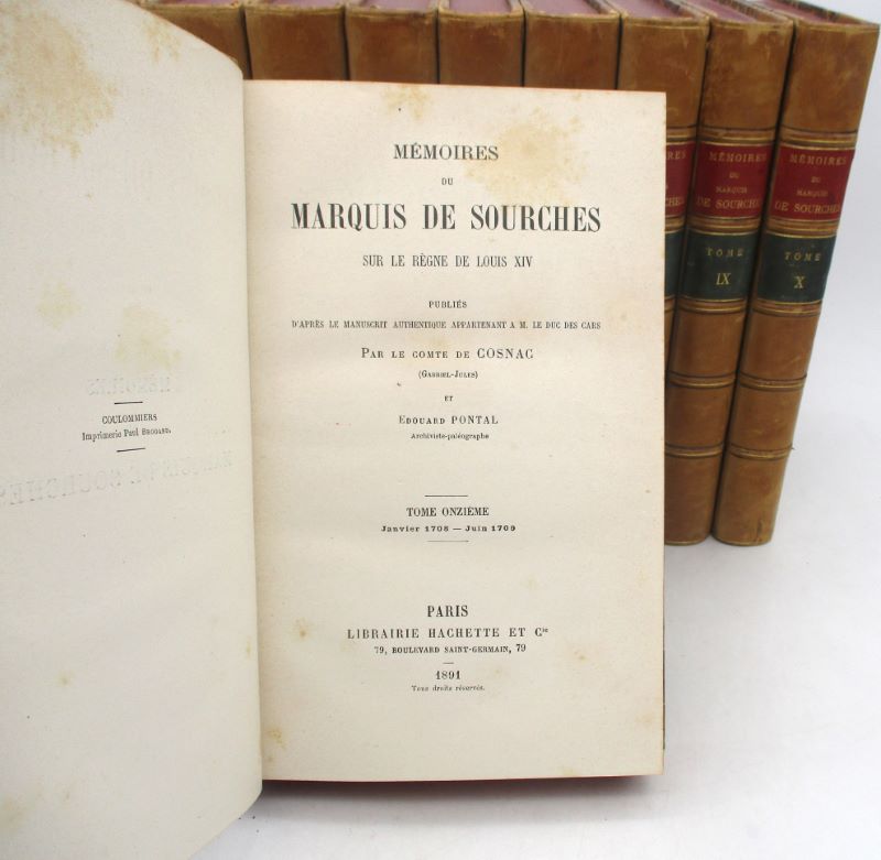 Édition établie par le comte de Cosnac, Arthur Bertrand et Édouard Pontal s’étendant sur la période de septembre 1681 à juin 1709. Le marquis de Sourches était Grand Prévôt de France, soit officier de la police de Cour avec juridiction sur les militaires de la Maison du Roi.