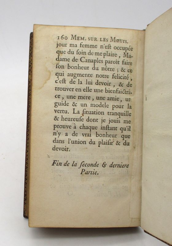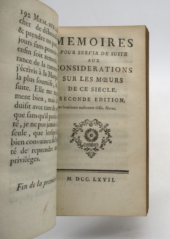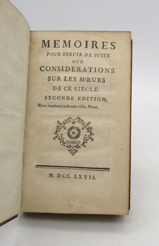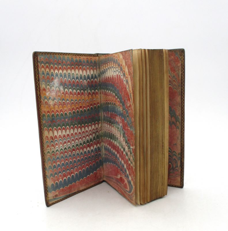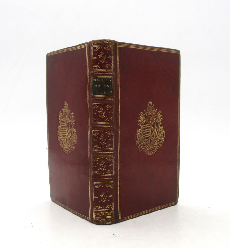S.l., s.n., 1767. 2 parties en 1 vol. in-12, [2]-192-[2]-160 pp., maroquin aux armes vieux rouge, triple filet doré en ecnadrement sur les plats, les armes d’alliance du comte et de la comtesse du Barry dorées au centre, dos à nerfs orné de caissons dorés, pièce de titre verte, tranches dorées.