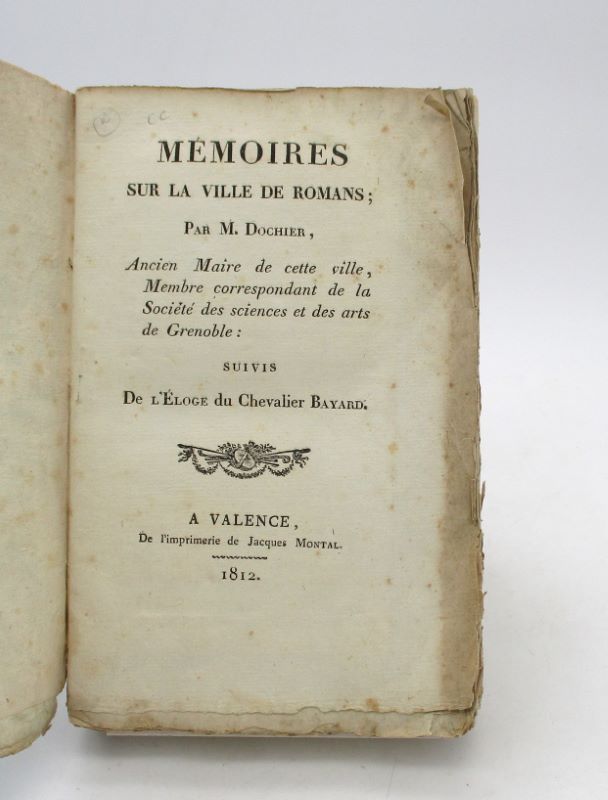 ![Image supplémentaire du livre Estimation du livre « mémoires sur la ville de Romans ; par M. Dochier, ancien maire de cette ville […]. Suivis de L’Eloge du Chevalier Bayard. »](https://lafrancaisedulivre.com/wp-content/uploads/17009_1.jpg)