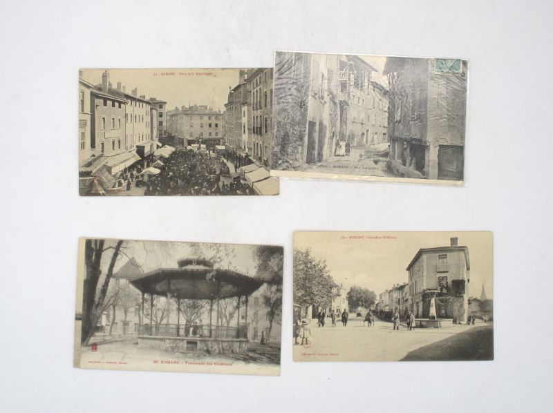 Très jolie couverture de livraison en papier dominoté, avec pièce de titre imprimée. Sont jointes 5 cartes postales représentant Romans.