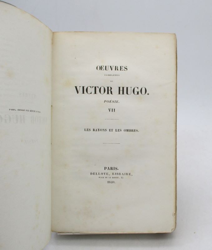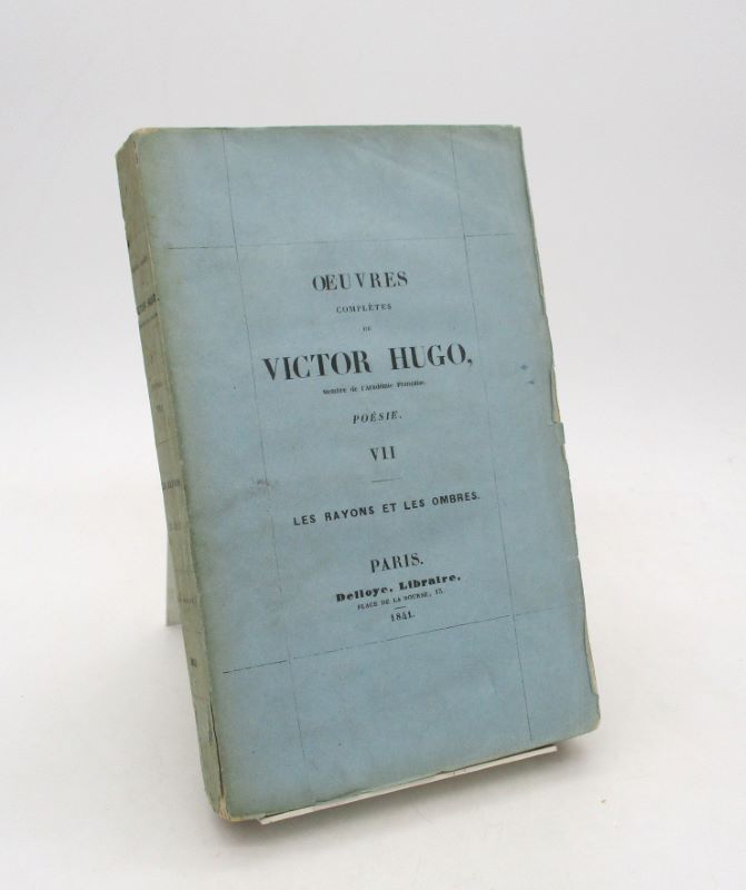 Édition originale de ce recueil paru dans la première édition des oeuvres complètes de Victor Hugo qui ne fut tiré qu’à seulement 1500 exemplaires. Le présent exemplaire comporte la couverture en date de 1841 alors que la page de titre porte celle de 1840 mais comporte bien la mention de l’éditeur Delloye. Carteret, I, p.412; Clouzet, p. 147.