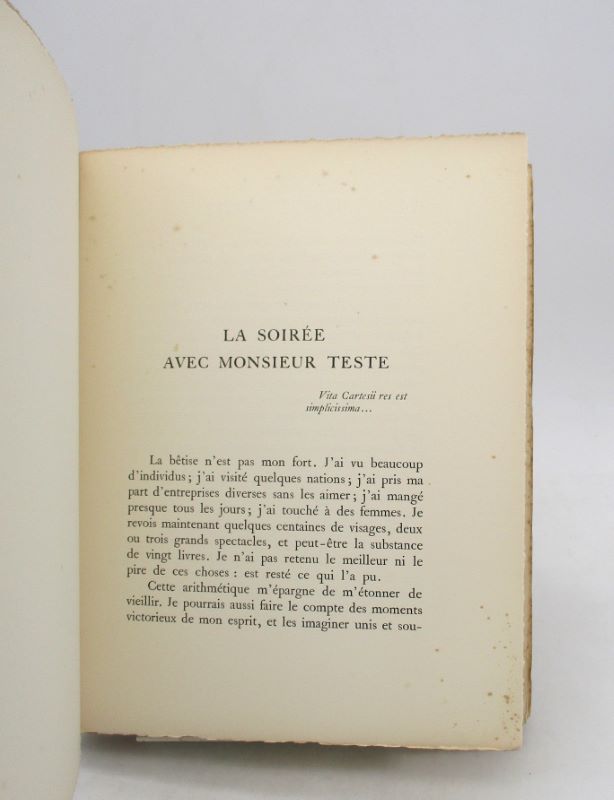Édition réunissant les oeuvres suivantes : Monsieur Teste (1895), La Soirée, Lettre dÉmilie, Le Log-Book et Quelques Épîtres. Un des 1000 exemplaires sur vélin de Rives. Ex-libris gravé de R. Cortot.