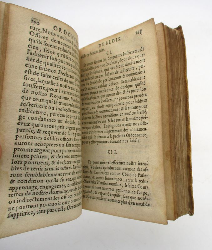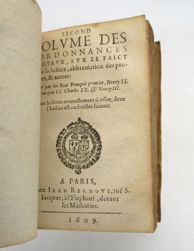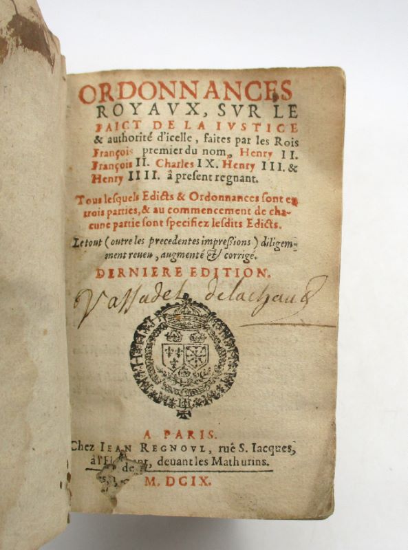 Nouvelle édition dont l’originale a paru en 1603 et qui recueille des textes encadrant la justice en France au temps de la Renaissance et des Guerres de religion. Les pages de titre des deux premières parties sont ornées des armes d’Henri IV. Ex-libris manuscrit au titre Vassade Delachaux.
