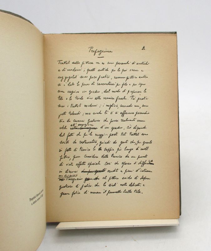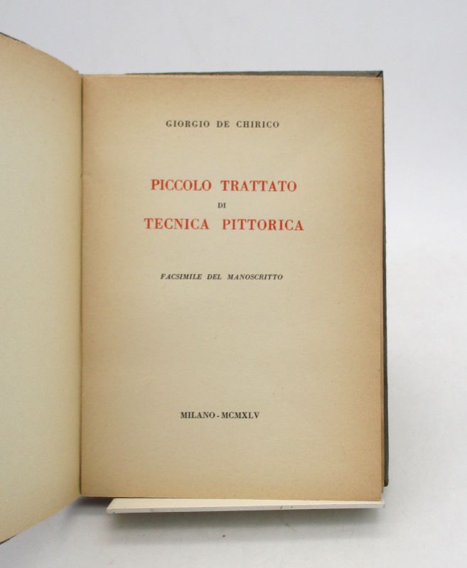 Fac-similé du manuscrit de ce traité paru pour la première fois en 1928. Un des 500 exemplaires tirés sur papier fait main, seul tirage annoncé, réservé aux « amis du livre » [per gli amici del libro].