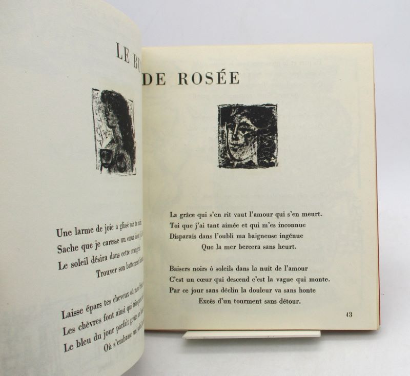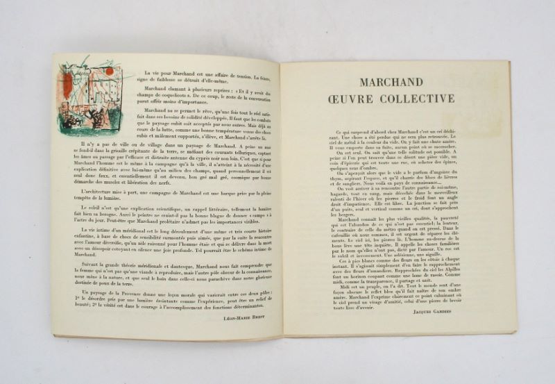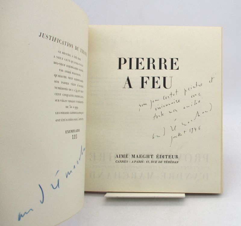 Édition originale illustrée de 50 lithographies en noir et de la couverture en couleurs d’André Marchand, tirées par Mourlot. Il réunit des textes de Georges Hugnet, Raymond Queneau,Atlan, Paul Éluard, Pierre Seghers, Gaston Chaissac ou encore Édouard Jaguer. Un des 150 exemplaires sur vélin vidalon, signé à la justification par l’artiste, celui-ci comporte un envoi autographe signé à Jean Cortot, un peintre et illustrateur français. Cet exemplaire comprend un second volume de même format intitulé André Marchand, chez le même éditeur, illustré d’une couverture et de 5 lithographies en couleurs. Un des 999 exemplaires sur vélin vidalon, seul tirage annoncé.