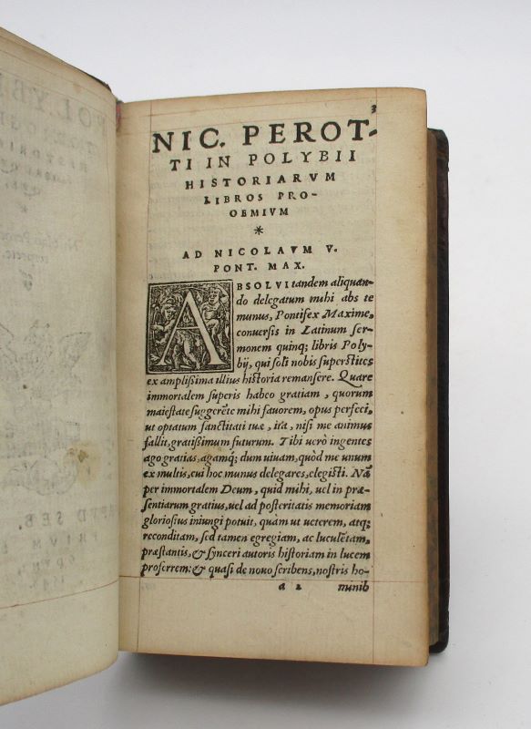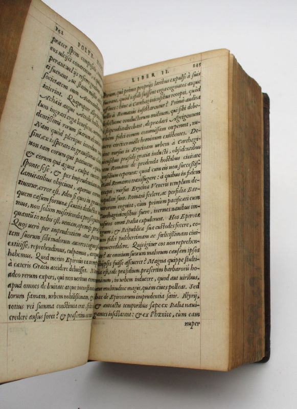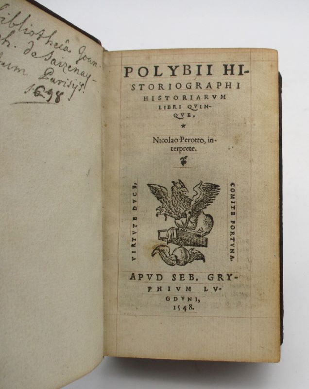Nouvelle édition des cinq livres d’Histoire de Polybe qui étudient notamment l’arrivée de la domination romaine en Méditerranée et les guerres puniques. Cet exemplaire est réglé de rouge, il comprend une marque de l’éditeur sur le titre. Chaque livre est orné d’une lettrine gravée sur bois en début de texte. Exemplaire relié aux armes de Louis Bizeau, un conseiller du parlement de Paris ayant vécu au début du XVIIe siècle, ex-libris manuscrit « Joan. Steph. de Sairenay », daté 1698.
