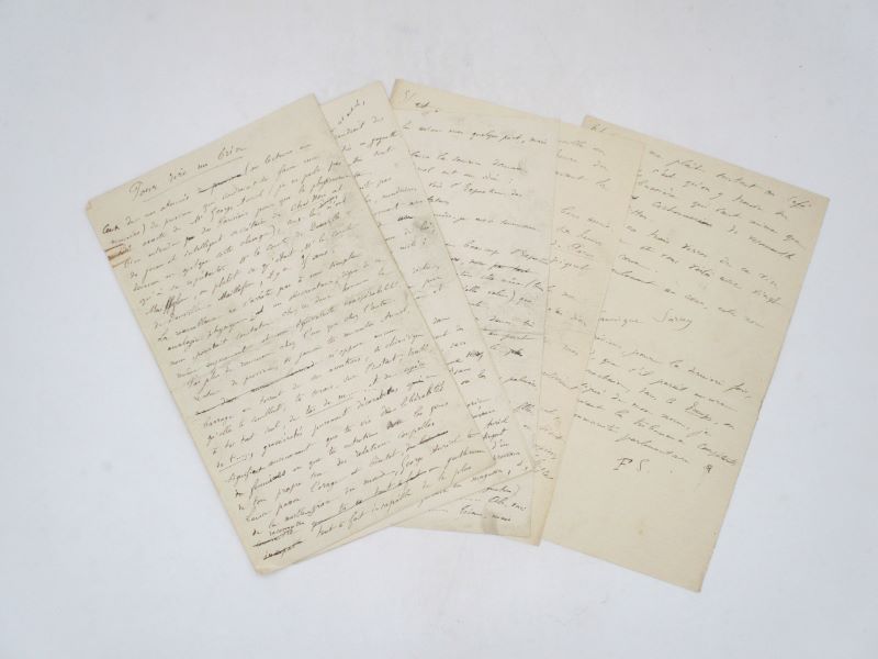 Manuscrit autographe signé partiel de ce portrait à l’acide de Georges Auriol qu’il compare au « comte de Douville-Maillefeu », à un homme qui « ne conçoit pas qu’il puisse exister des barrières sociales » dont le « passe-temps favori » et de « bombarder sans trêve » de lentilles « les chapeaux des passants ». Il évoque quelques anecdotes qu’il a vécu avec Auriol à un exposition d’artistes féminines. Ce texte a paru en une dans le numéro du Chat noir du samedi 2 mars 1889. On joint un manuscrit autographe du même dont il manque les 4 premiers feuillets à propos de ses fréquentations au Café de Paris (2 pp. in-8) qui ne semble pas avoir paru dans la même revue.