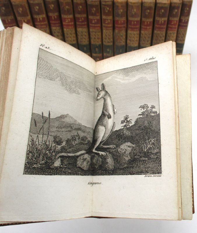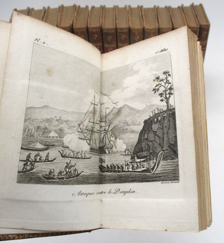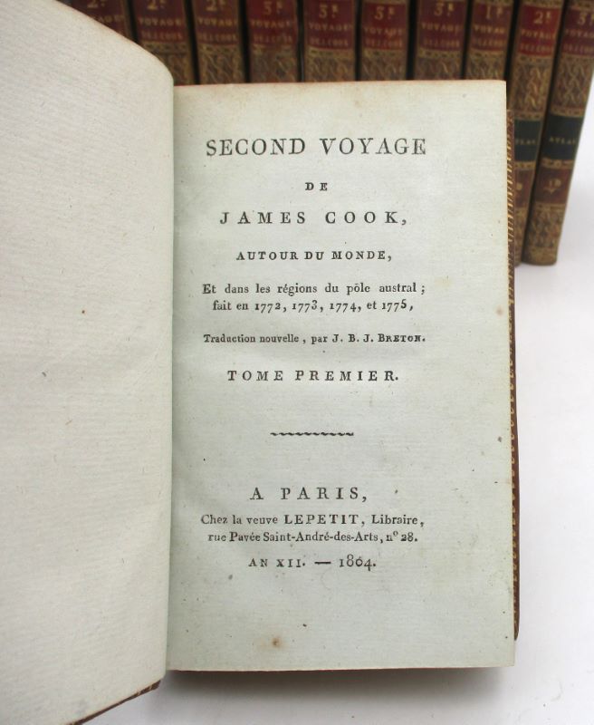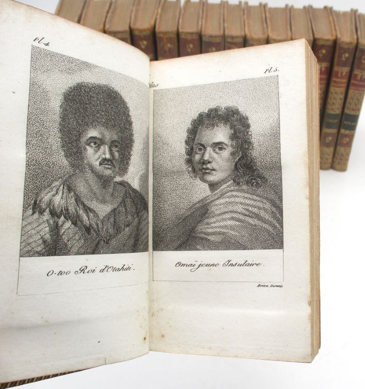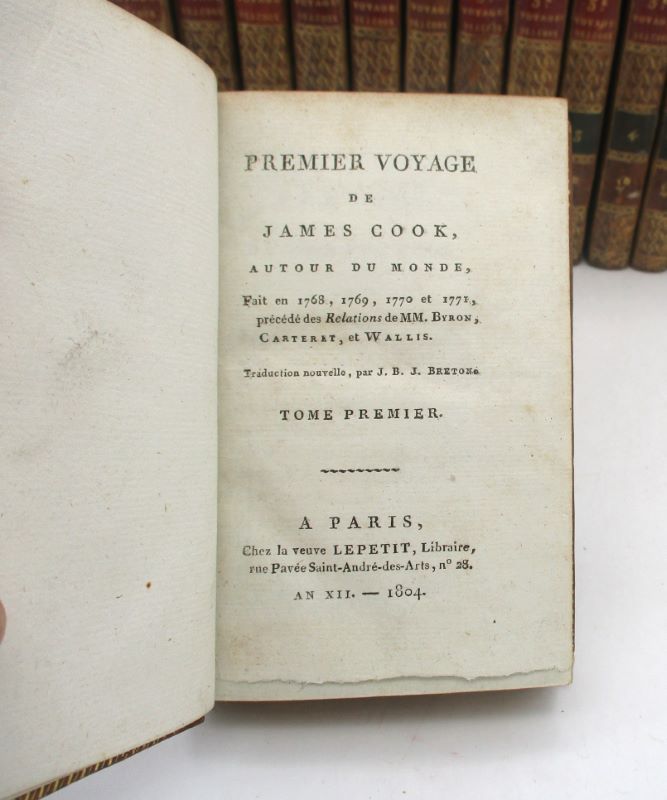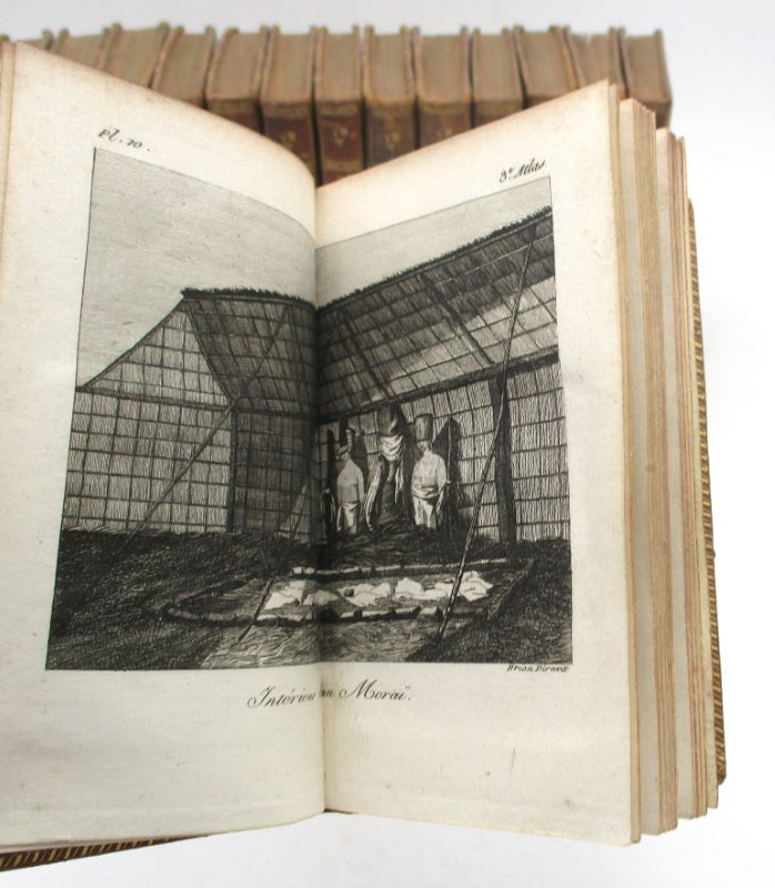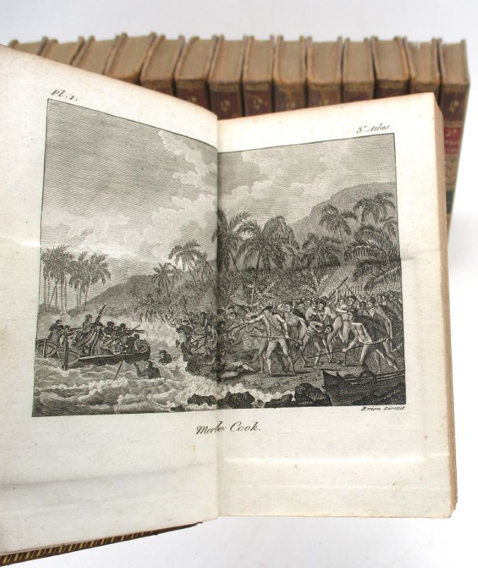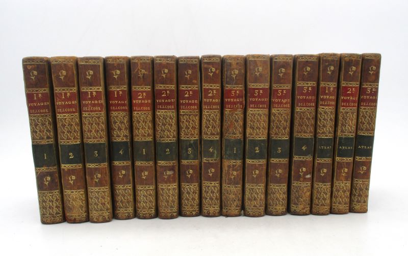 Ensemble des trois voyages de Cook publiés dans la Bibliothèque portative des voyages, traduits par J.B.J. Breton. Le premier voyage relate son tour du monde fait entre 1768, et 1771. Il comporte également les Relations de Byron, Carteret et Wallis et un atlas de 24 planches. Le deuxième comprend 27 (sur 28) planches dans son atlas et la relation de son voyage dans les terres australes entre 1772 et 1775. Enfin le troisième et dernier voyage est illustré d’un atlas de 24 planches et concerne son voyage de la côte Nord-Ouest des États-Unis, la côte Nord-Est de l’Asie et dans les régions boréales entre 1776 et 1780. Les planches représentent des cartes, des indigènes, des paysages ou encore des objets d’autochtones. Les relations de voyages de Cook sont devenues populaires dès leur première publication à la fin du XVIIIe siècle et connaîtront maintes rééditions ou traductions. Bonne édition tirée sur vergé dans une jolie reliure de l’époque.