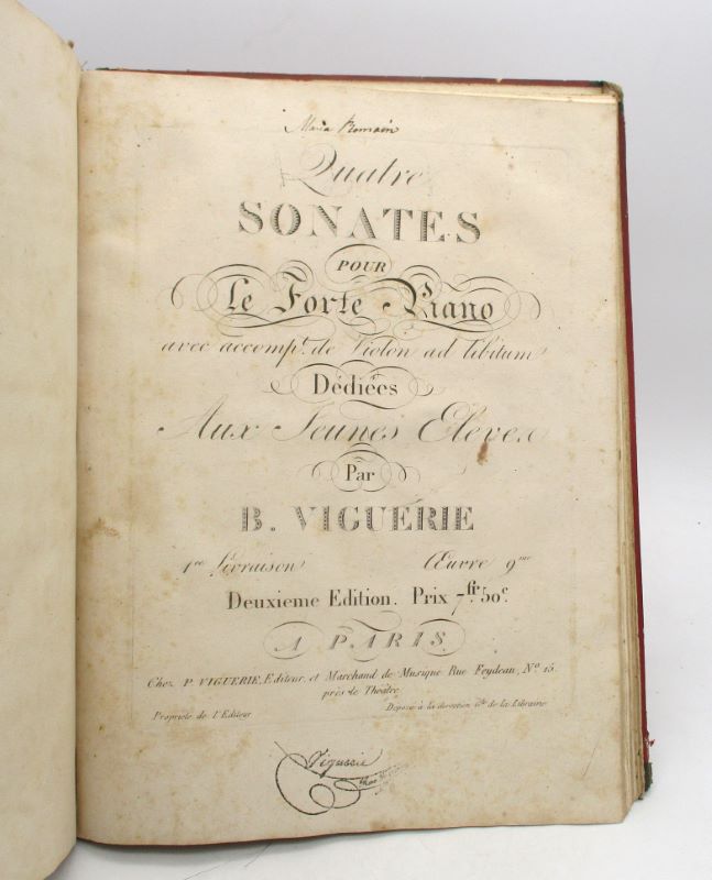 1- RIES (Ferdinand). Fantasia for the Piano forte, or Harp in which is introduced two much admired Irish airs. Dublin, J. Willis, [vers 1815]. 12 pp. 2- ANONYME. Miss Forbes’ Farewell with Variations for the Piano Forte. Dublin, W. Power, [première moitié du XIXe siècle]. 3 pp. 3- MOZART (Wolfgang Amadeus). The favorite Overture, Songs, Duetts, &c in Mozart celebrated Le Nozze di Figaro for the Piano Forte, Harp, Flute & Violoncello […] by J. Mazzinghi. Londres, Goulding, D’Almaine, Potter & Co., [vers 1830]. 12-9-4-3 pp. Les deux premières partitions comportent une page de titre illustrée d’une vignette gravée par Hopwood. 4- LOGIER (J.B.). Strains of other Days. Being a Selection of Favorite Irish Airs arranged for the Piano Forte and dedicated to the Irish Harp Societies. Dublin, J.B. Logiers, [vers 1810]. 7 p. et un f. de titre orné d’une vignette gravée. 5- [GLUCK ( Christoph Willibald von)]. Ouverture de Iphigénie arrangée pour Forte-Piano, avec accompag[nement] de Violon. Paris, B. Viguerie, 6-3 pp. et 1 f. de titre. 6- [ROSSINI (Gioacchino)] PANORMO (Ferdinand Charles). Panormo’s Brillant Variations for the Piano Forte to the celebrated Air of Di Fanti Palpiti. Londres, published by the Author, [vers 1820]. 13 pp. et 1 f. de titre. 7- STEIBELT (Daniel); LATOUR (Jean Théodore). L’Orage, ronde pastorale pour le piano forte en imitation du célèbre Rondo, de Steibelt. Londres, Chappell & Co., [vers 1810]. 12 pp. et 1 f. de titre. 8- Quatre sonates pour le piano forte avec accompag[nement] de violon ad libitum. Paris, P. Viguerie, [première moitié du XIXe siècle]. 19-7 pp. et 1 f. de titre. 2e édition. 9- MAZZINGHI (J.). Bavarian Air with Variations for the Piano Forte, and accompagnement for the Flute. Londres, Goulding, D’Almaine, Potter & Cie, [vers 1810]. 8 pp. 10- VIGUERIE, B. Premier Concerto pour Forte-Piano avec accompagnement de deux violons alto et basse. Paris, B. Viguerie, [première moitié du XIXe siècle]. 11 pp. et 1 f. de titre comportant la signature du compositeur et éditeur de musique. 11- PLEYEL (Ignace). A favorite – Sonata for the Piano Forte, in which is introduced the admired Air of Roys wife. Dublin, W. Poer & Co, [vers 1810]. 8 pp. et 1 f. de titre comprenant la griffe de l’éditeur. 12- PANORMO (Ferdinand Charles). Les Savoyards Air Pandéan, avec Variations et Imitations. Dublin, W. Power, [première moitié du XIXe siècle]. 11 pp. Ex-libris manuscrit Maria Romain à plusieurs titres.