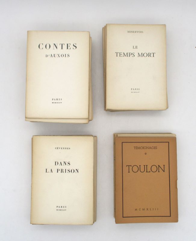 Rééditions des publications clandestines des Éditions de Minuit parues pendant l’Occupation, chacune étant un des 3500 exemplaires sur vélin ou vergé. On joint Jacques Debû-Bridel, Les Éditions de Minuit : Historique et Bibliographie. Paris, Éditions de Minuit, 1945, un des 3500 exemplaires sur vélin et 3 volumes de la Collection Témoignages : Toulon, 1943, un des 3500 exemplaires sur vélin, Le Crime contre l’esprit, 1944 et L’Armistice 12-16 juin 1940, 1944, les deux derniers étant un des 3500 exemplaires sur vergé. Complet de l’avis au souscripteur et le feuillet d’excuses à M. X… Liste des titres : 1. VERCORS [BRULLER, Jean]. Le Silence de la mer. 2. [PONGE PAULHAN BENDA DESVIGNES BEBÛ-BRIDEL – VERCORS]. Chroniques interdites.3. [SEGHERS, Pierre ELUARD, Paul LESCURE, Jean]. LHonneur des poètes. 4. FOREZ [MARIAC, François]. Le Cahier noir. 5. THIMERAIS [MOTCHANE, Léon]. La Pensée patiente.6. FRANÇOIS LA COLERE [ARAGON, Louis]. Le Musée Grévin. 7. DANIEL, Laurent [TRIOLET, Elsa]. Les Amants dAvignon.8. ARGONNE [DEBÛ-BRIDEL, Jacques]. Angleterre.9. AUXOIS [THOMAS, Edith]. Contes dAuxois. 10. VERCORS [BRULLER, Jean]. La Marche à létoile.11. [COLLECTIF]. Europe. 12. NOIR, Jean [CASSOU, Jean]. 33 sonnets omposées au secret.13. VIVARAIS [BOST (Pierre)] La Haute Fourche14. MINERVOIS [AVELINE, Claude]. Le temps mort. 15. MORTAGNE [MORGAN, Claude]. La Marque de lhomme. 16. ARAGON, Louis VERCORS]. Deux voix françaises : Péguy-Péri17. [MORGAN GIDE MORTIMER AUDISIO BELLANGER CHAMSON]. Nouvelles chroniques [Chroniques II]19. CEVENNES [GUEHENNO, Jean]. Dans la prison. 20. HAINAUT [ADAM, George]. A lappel de la liberté.21. STEINBECK, John. Nuits noires.