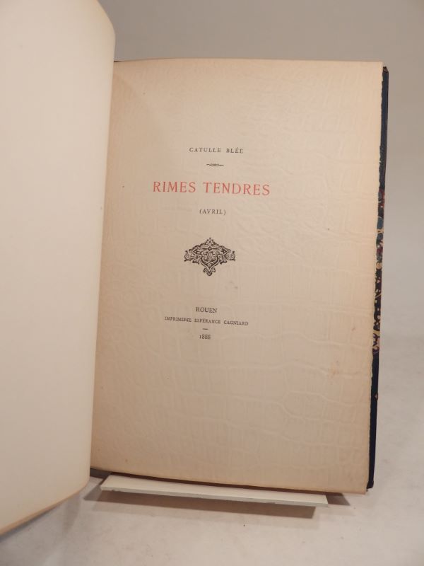 Rouen, Imprimerie Espérance Cagniard, 1888. Plaquette in-8, (9) ff., reliure demi-chagrin turquoise à coins, titre dorée en long au dos, couverture gaufrée conservée.