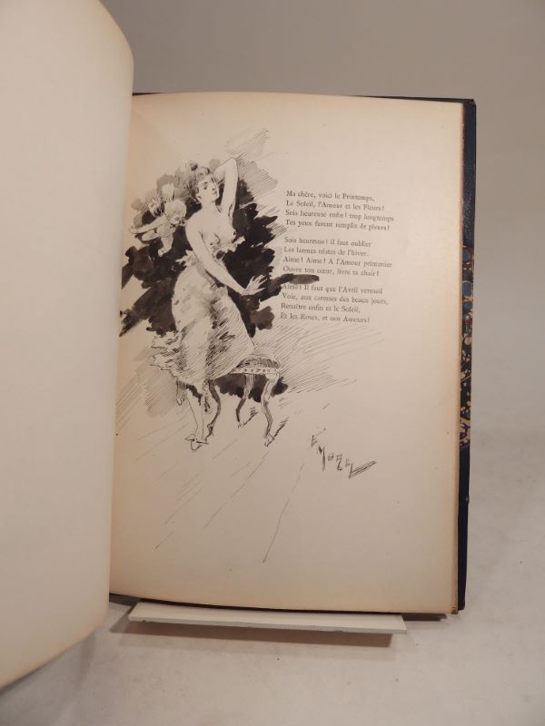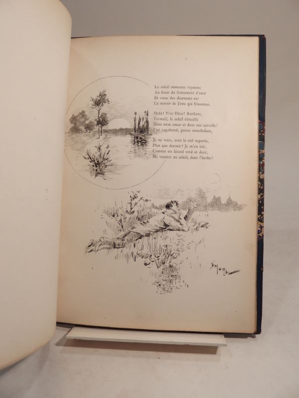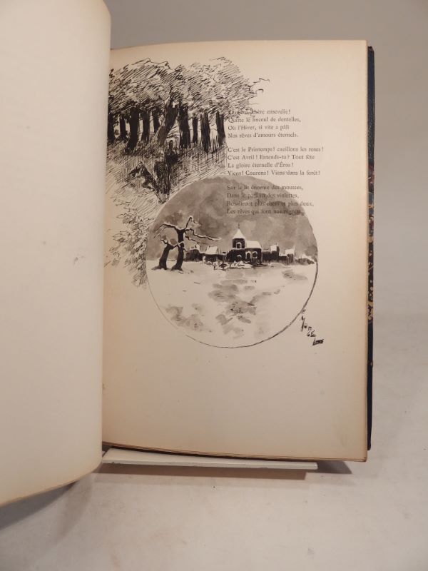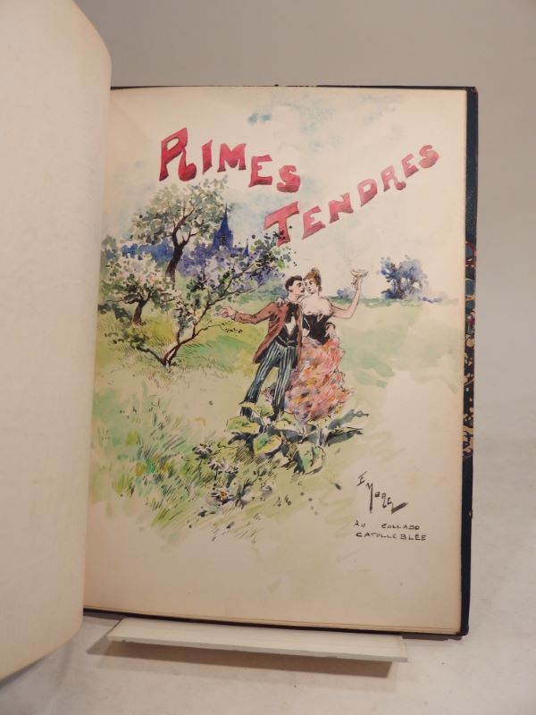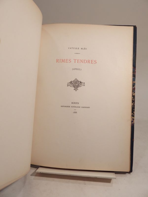 Edition originale de cette rare plaquette de poésie éditée à Rouen, EXEMPLAIRE UNIQUE de l’auteur, entièrement illustré de charmants DESSINS ORIGINAUX SIGNES par E. Morel (au total 8 dessins à l’encre, dont 2 rehaussés à l’aquarelle) avec ENVOIS de l’artiste à l’auteur (« Au Collabo Catulle Blée », « Au Poète des Rimes tendres »), datés 1888.