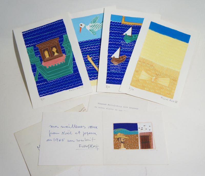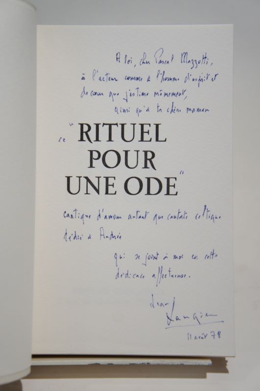 Édition originale, un des 30 sur vélin d’Arches, enrichi de quatre jolies GOUACHES ORIGINALES SIGNÉES et numérotées par Vincent Fillol Roig. Long ENVOI à Pascal Mazotti au faux-titre, à « l’acteur comme à l’homme d’esprit et de cur ». Joint une carte de vux de Roig, 1964, ornée d’une petite gouache originale.