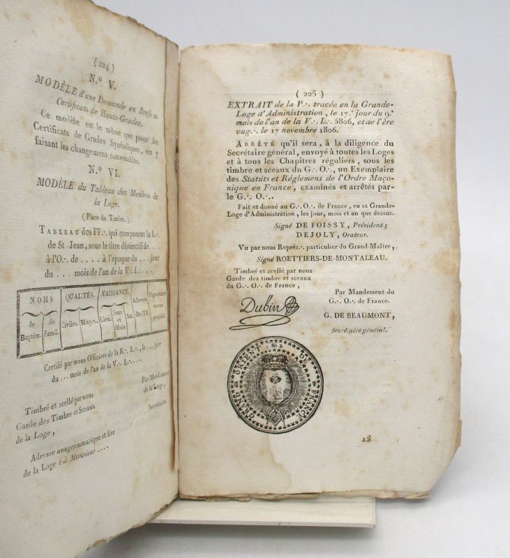 Paris, imprimerie du G. O. de France, an de la V.L. 5806 [Imprimerie du Grand-Orient de France, 1806]. In-8, XI-232 pp., broché, couverture muette.