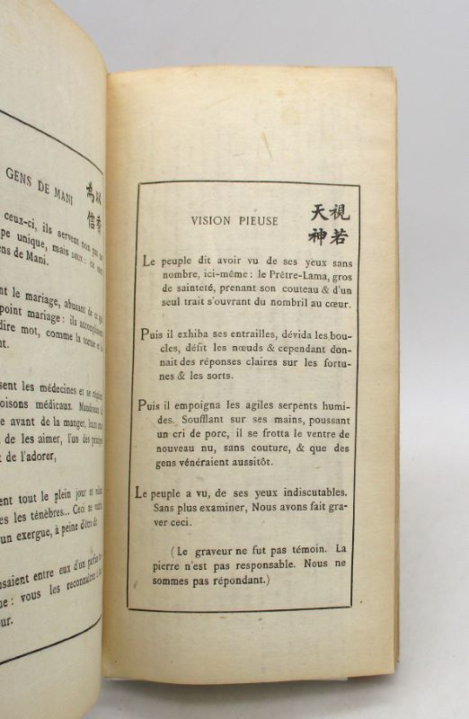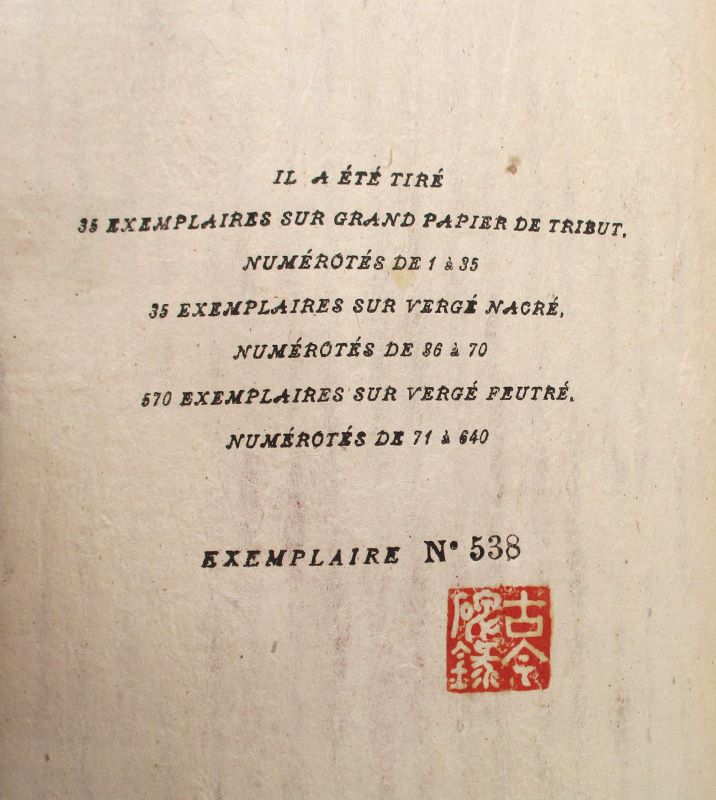 Édition en partie originale pour 16 poèmes, composée sous la direction de Victor Segalen à Pékin. Un des 570 exemplaires sur vergé feutré.