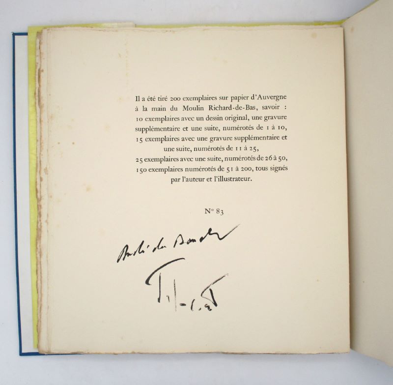 Édition originale illustrée des aquatintes originales de Tal-Coat tirées par l’atelier Crommelynck. Un des 150 exemplaires tirés sur papier d’Auvergne, signé à la justification par l’artiste et l’auteur.