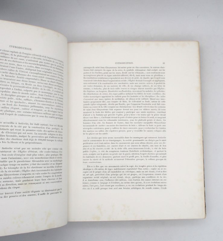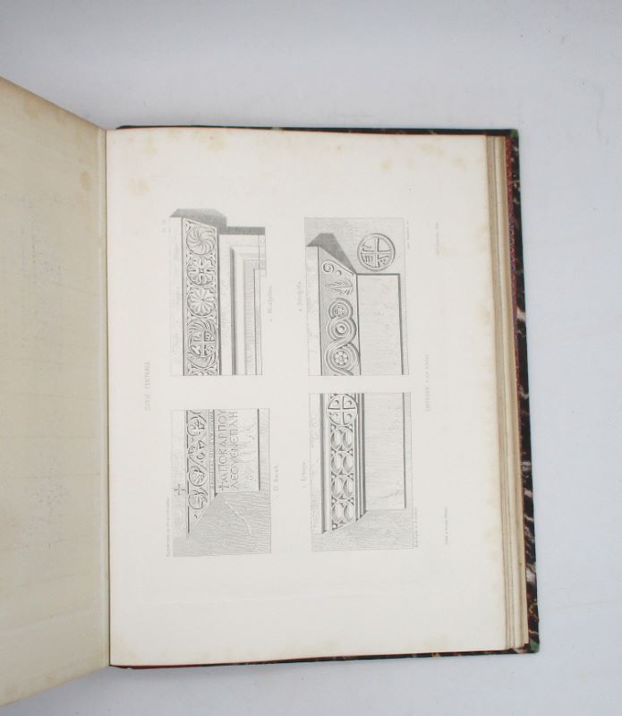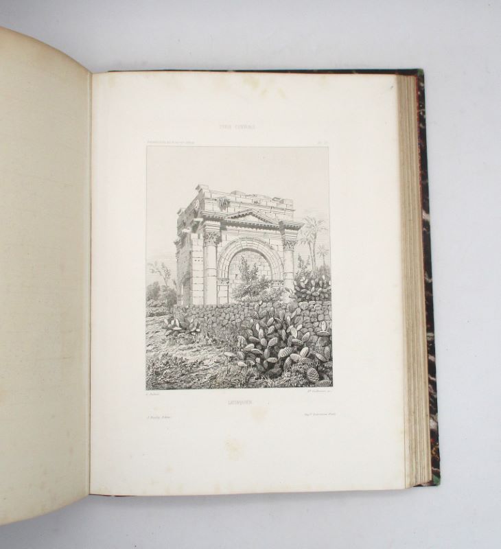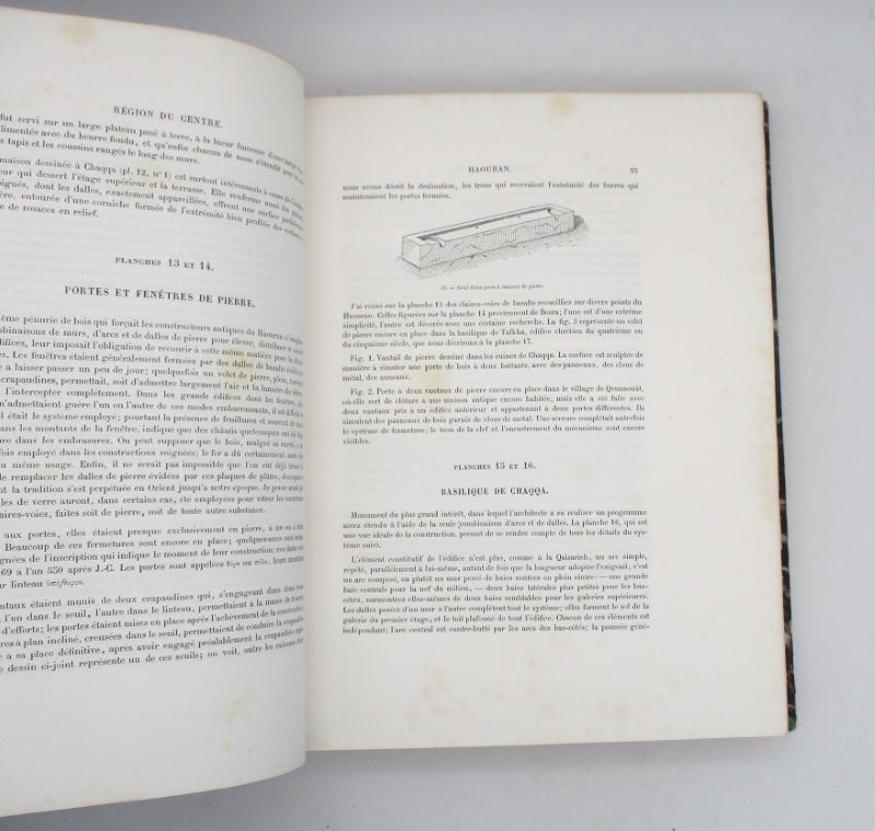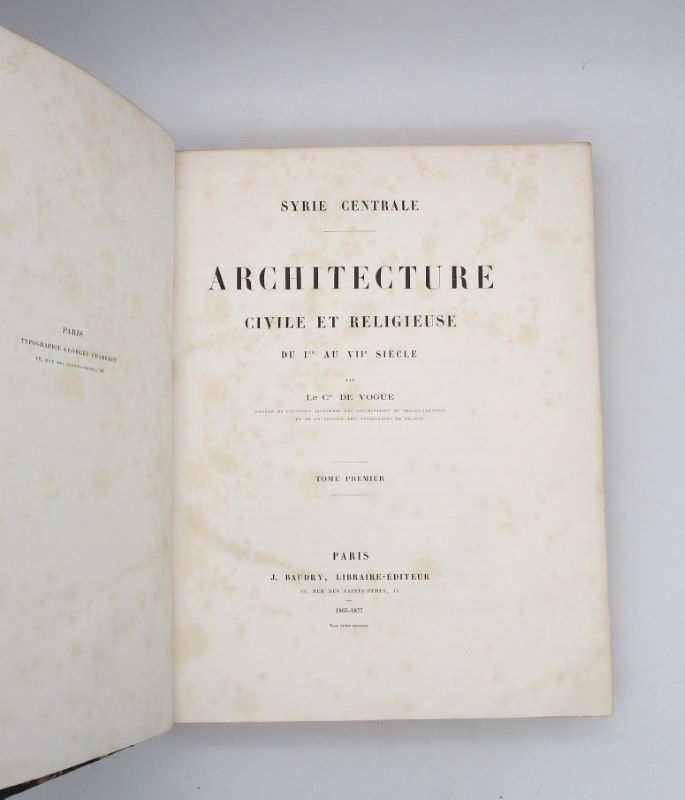Édition originale de cette monumentale monographie d’architecture syrienne. Elle est illustrée de 3 cartes dont 2 en couleurs, de 152 planches dont une couleurs et de nombreuses figures dans le texte, la plupart l’oeuvre de M. E. Duthoit, un architecte élève de Viollet-le-Duc. Cet ouvrage est le fruit des observations récoltées par Vogüé, Duthoit et William Waddington lors d’un long voyage en Syrie en 1853 et 1854. Ils y firent de nombreuses découvertes et mirent au jour l’influence de l’architecture byzantine sur l’architecture médiévale occidentale. Le comte de Vogüé les réunit dans cet ouvrage fondamental dont la parution s’étala sur une douzaine d’années. Blackmer, 1502. Rare.