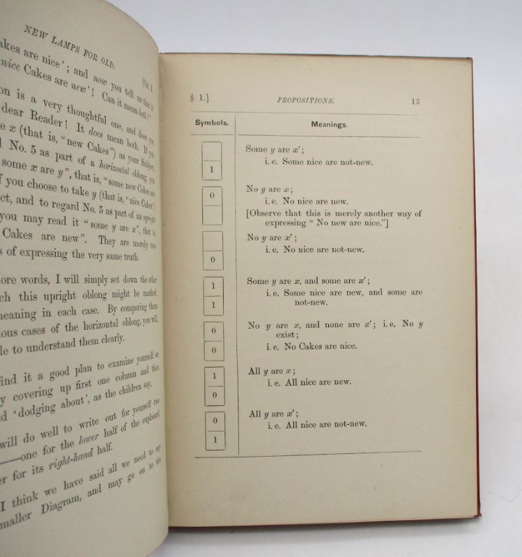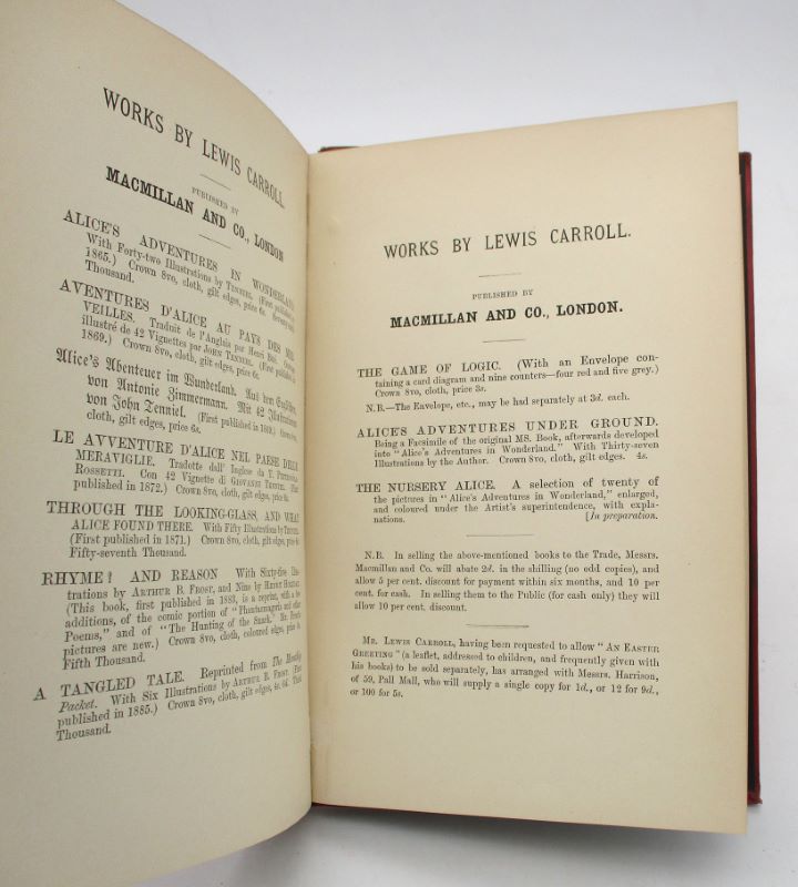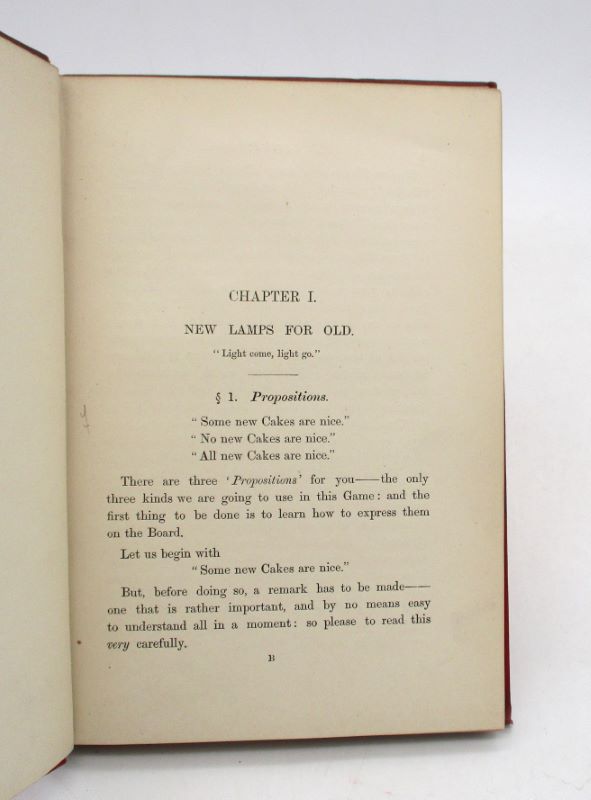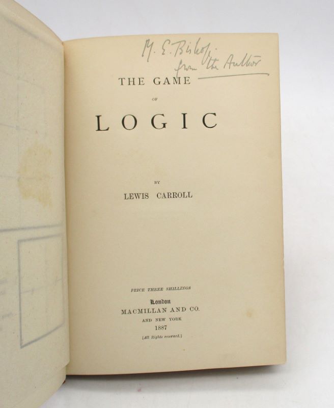 Nouvelle édition, parue l’année suivant l’originale, de ce recueil de jeux de logique. Cet exemplaire comporte un envoi autographe de l’auteur à E. Bishop. Complet du catalogue des oeuvres de Lewis publiée chez MacMillan and Co.