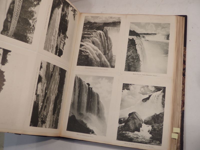 EXEMPLAIRE UNIQUE, récit d’un voyage en Amérique, fait d’une table et de titres manuscrits (dont la jolie page de couverture avec dessins), de TIRAGES PHOTOGRAPHIQUES ORIGINAUX de l’époque contrecollés (18 tirages 11 x 8 cm, un de 7 x 8 cm, 7 de 17,5 x 11,5 cm, un de 21 x 17 cm, un de 25,5 x 13,5 cm) traversée en paquebot, chûtes du Niagara, Boston, Governor’s Island NY, New York) et de documents variés, montés ou contrecollés : des documents de la traversée (3 menus de la Compagnie générale transatlantique, 2 listes des passagers, un plan dépliant en couleurs du Bourgogne), des cartes et plans en couleurs (Washington, Chicago, New York, et une carte dépliante de la côte), des gravures découpées (représentations de rues, monuments, paysages, intérieurs de trains) et des cartes imagées et postales (comme une série de 19 cartes des chûtes du Niagara), des prospectus divers, et des chapitres du Tour du Monde (dont Chicago et l’Exposition universelle colombienne par Bruwaert, Excursion au Canada par Lamothe), de la Revue encyclopédique et de livres (Nao Santa Maria, Les Capitales du Monde). *** Table des chapitres et Itinéraire (extraits) : La rivière Hudson, De New York à New Burg, Le Port, Les Docks, Les Palissadfe, Le Mont St. Vincent, West Point, La Rivière de l’Est – Départ du Havre par le paquebot La Bourgogne, Baie de New York, Sandy Hook, New Jersey, Long Island, Les Narrow, Ile Bedlow, La Liberté de Bartholdi, Ile de Manhattan, Pont de Brooklyn – Philadelphie, les quais de la Delaware, Fairmount Park […] – Baltimore – Washington – Chicago par la Vallée du Potomac, les montagnes Allighamier, Pittsburg – Chicago, Hôtel de Ville, Auditorium, Temple maçonnique, Jackson Park, Lincoln Park, Lac Michigan, Union Stock Yards, Pullman City – Exposition colombienne (Exposition Universelle colombienne à Chicago, de New York, Boston et l’Est) – Le Canada, les Chutes du Niagara, Le lac Erié, Niagara Falls, Le lac Ontario, Toronto – De Kingston à Montréal par le Saint-Laurent – De Montréal à Québec – Québec – Montréal – De Montréal à Boston – Boston – De Boston à New York par Fall River et Long Island – New York, Parc de la Batterie, Broadway Street, Cinquième Avenue, Central Park, Coney Island – Départ de New York par la Gascogne, arrivée au Havre.
