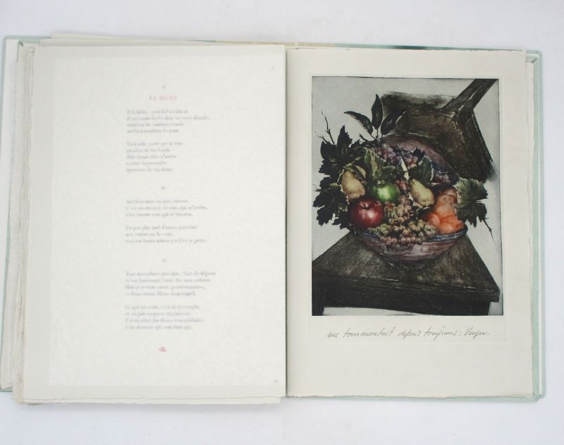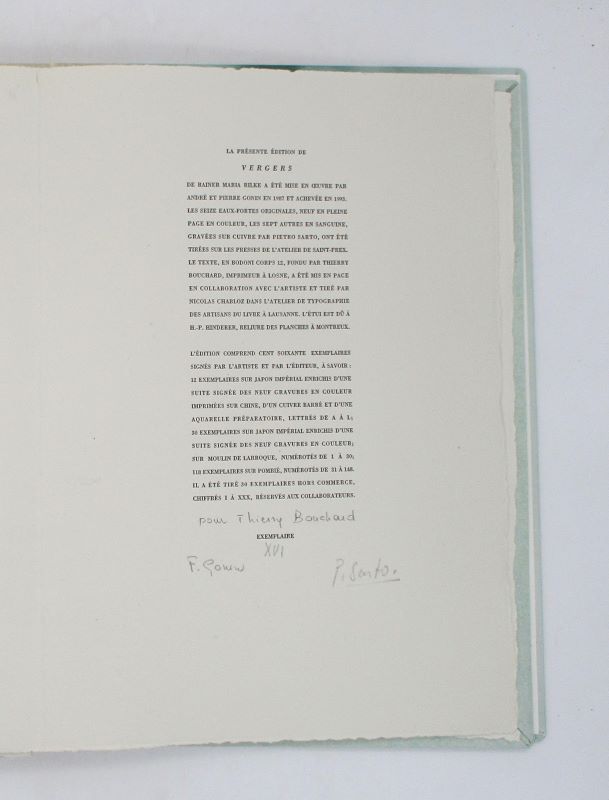 Édition illustrée de 16 eaux-fortes en couleurs dont 9 à pleine page. Un des 30 exemplaires hors commerce, réservés aux collaborateurs, signé à la justification par l’éditeur et l’artiste. Cet exemplaire comporte un envoi autographe de l’éditeur Pierre Gonin à l’éditeur et écrivain français Thierry Bouchard.