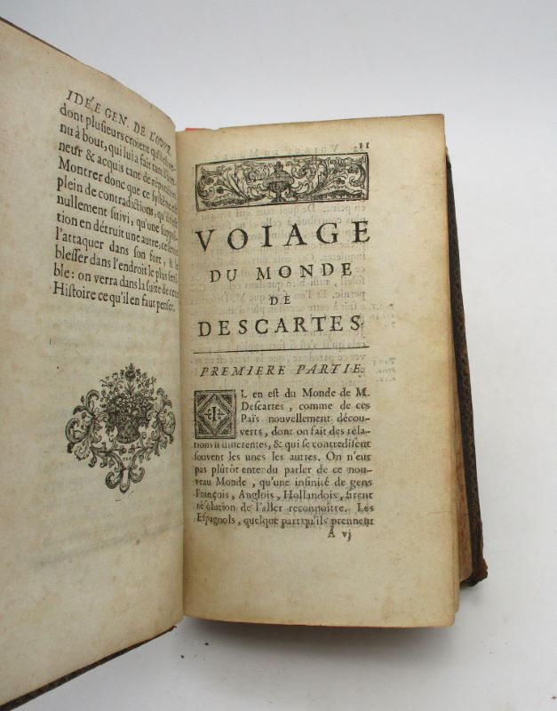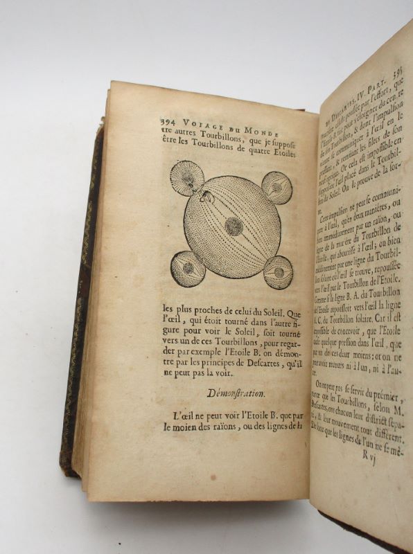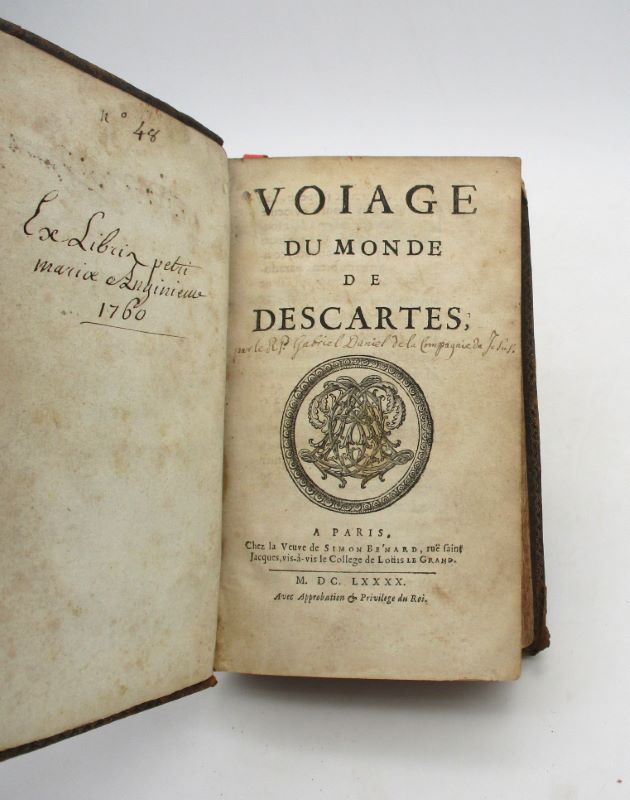 Édition originale de ce roman dans lequel le père Gabriel Daniel, un jésuite, réfute la théorie des tourbillons de Descartes. Cet ouvrage sera réédité et augmenté plusieurs fois, ainsi que plusieurs fois traduits. Il est orné d’une planche dépliante et de plusieurs figures dans le texte. Ex-libris manuscrits biffés, ex-libris manuscrit Petri Mariae Anginieme. Barbier, IV, 1081a; Backer, 1796.